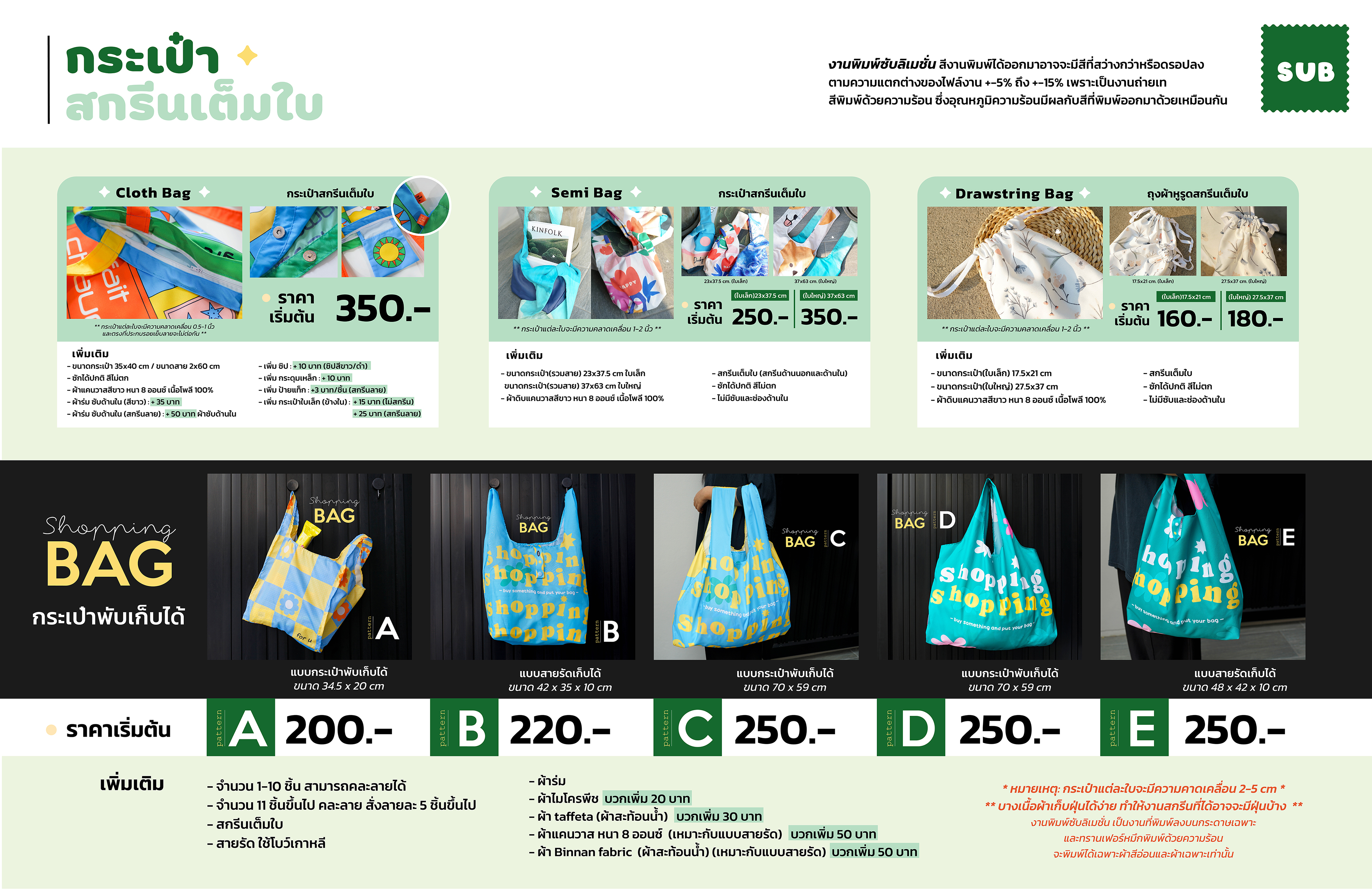 กระเป๋าช้อปปิ้งของเรามีหลายขนาด หลายรูปแบบให้เลือก ตามสไตล์ที่คุณชอบ สามารถออกแบบลายสกรีนเองได้เลย กระเป๋าช้อปปิ้งมีผ้าหลายวัสดุให้เลือกไม่ว่าจะผ้าร่ม ผ้าแคนวาส และผ้าอื่นๆที่ทำให้สินค้าดูมีความเก๋ขึ้นไปอีก สกรีนงานระบบซับเลมิชัน พิมพ์ด้วยเครื่องพิมพ์คุณภาพสูง สีสวยคมชัด สีไม่ซีดไม่หลุดลอก ขอบชิ้นงานรียบร้อยสวยงาม ไม่ว่าจะทำเพื่อจำหน่าย หรือ แจกเป็นของขวัญก็ทำได้ เรื่องงานพิมพ์ไว้ใจร้านพี่เป็ด iDuckyOfficial ได้เลยย คุณภาพดี งานมีคุณภาพแน่นอน!!