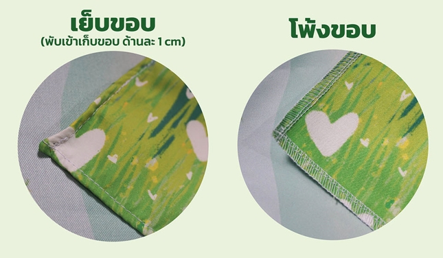 ตัวอย่างงานเย็บโพ้ง และ เย็บม้วนริมขอบ
