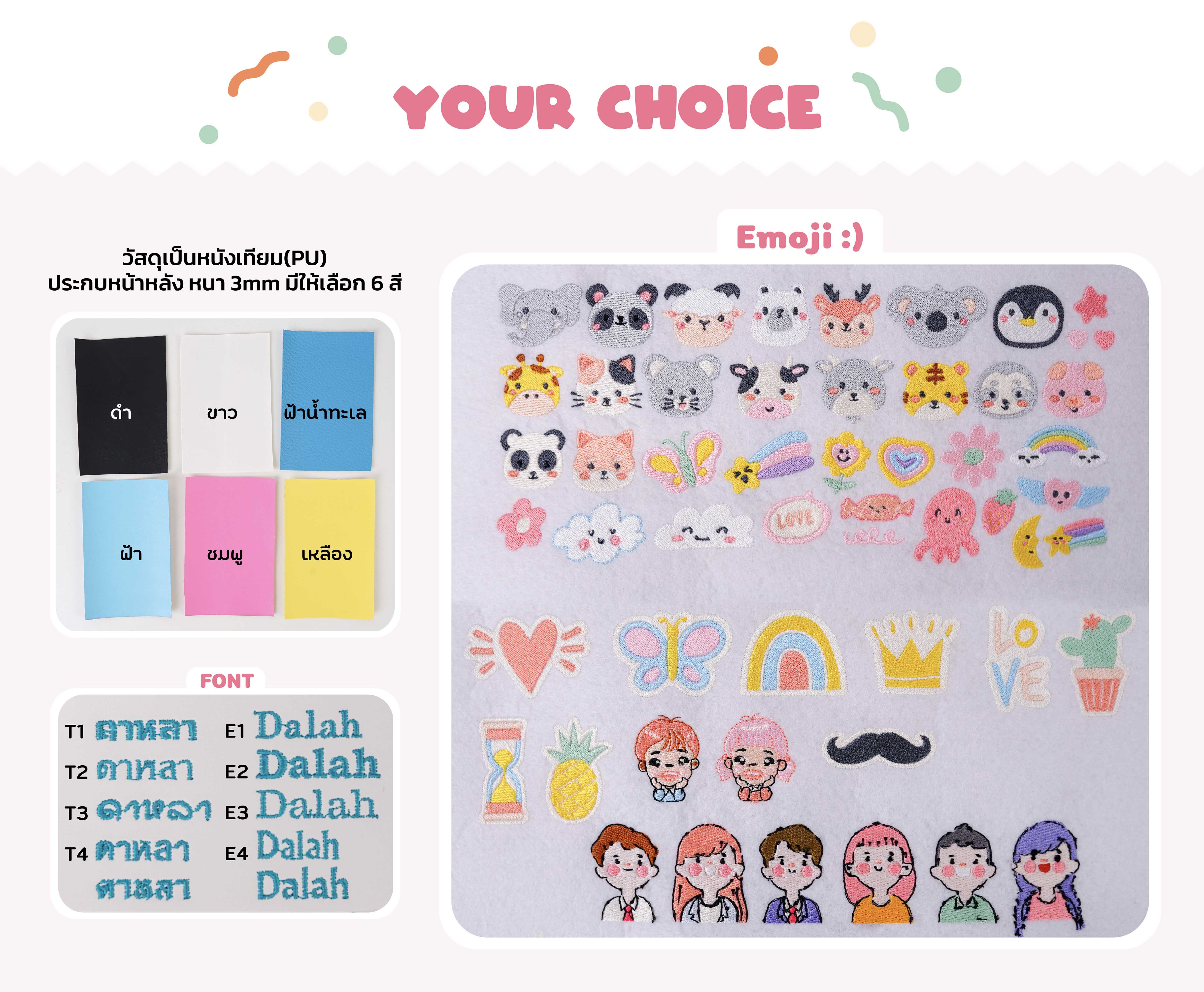 งานแบบทั้ง 5 แบบนั้นลูกค้าสามารถเปลี่ยนชื่อที่ปักลายได้ สามารถเลือกฟอนต์ เลือกลาย และที่สำคัญร้าน iDuckyshop ยังมีหนัง PU ให้เลือกถึง 6 สีอีกด้วยน้า