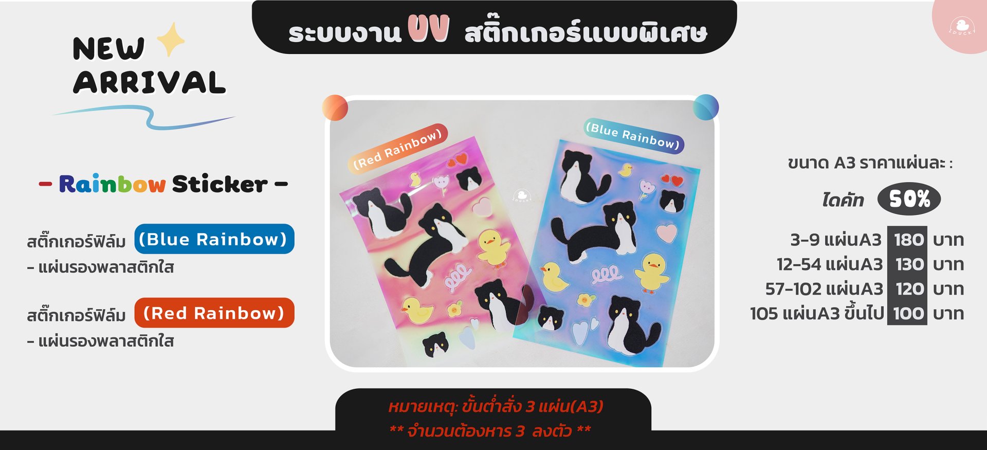 งาน UV เนื้อพิเศษ Rainbow จะมี 2 สี ได้แก่ Blue Rainbow และ Red Rainbow งานไดคัท 50% เป็นการไดคัทขอบตามรูปทรงต่างๆ จะไดคัทแค่ผิวสติ๊กเกอร์ด้านบนเท่านั้น ส่วนกระดาษรองหลังจะไม่ไดคัทขาด การใช้งานสามารถลอกสติ๊กเกอร์ออกมาใช้งานได้สะดวก โดย 1 ใบพิมพ์จะประกอบด้วยสติ๊กเกอร์หลายๆ ดวงๆ