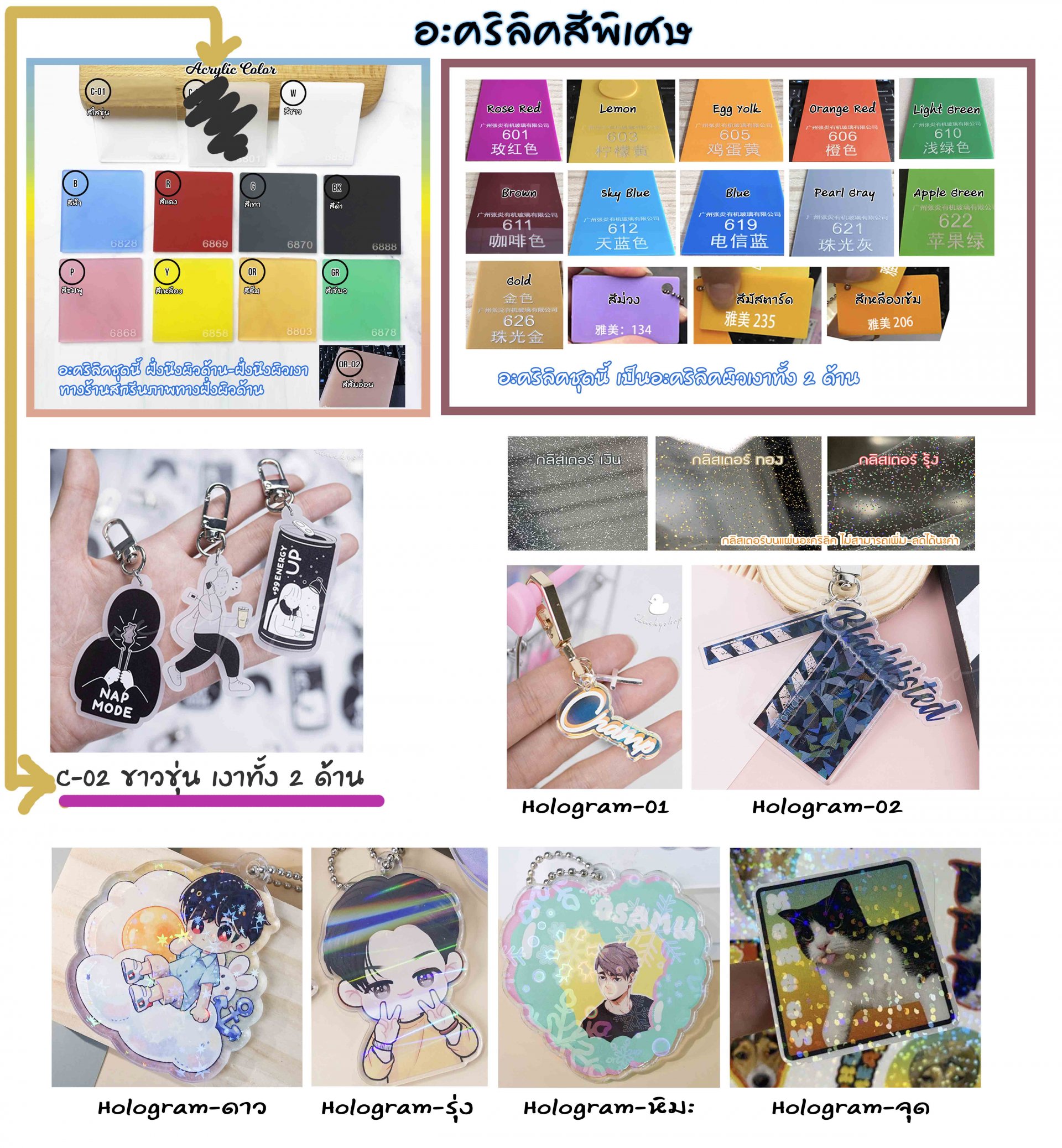 - อะคริลิคใส / Hologram-02 จะเป็นฟิลม์ใส , อะคริลิค Hologram-01 จะเป็นฟิล์มสีฟ้า , อะคริลิคสีพิเศษจะเป็นกระดาษสีน้ำตาล (ลูกค้าสามารถลอกออกหรือแกะออกเองได้เลยค่า)