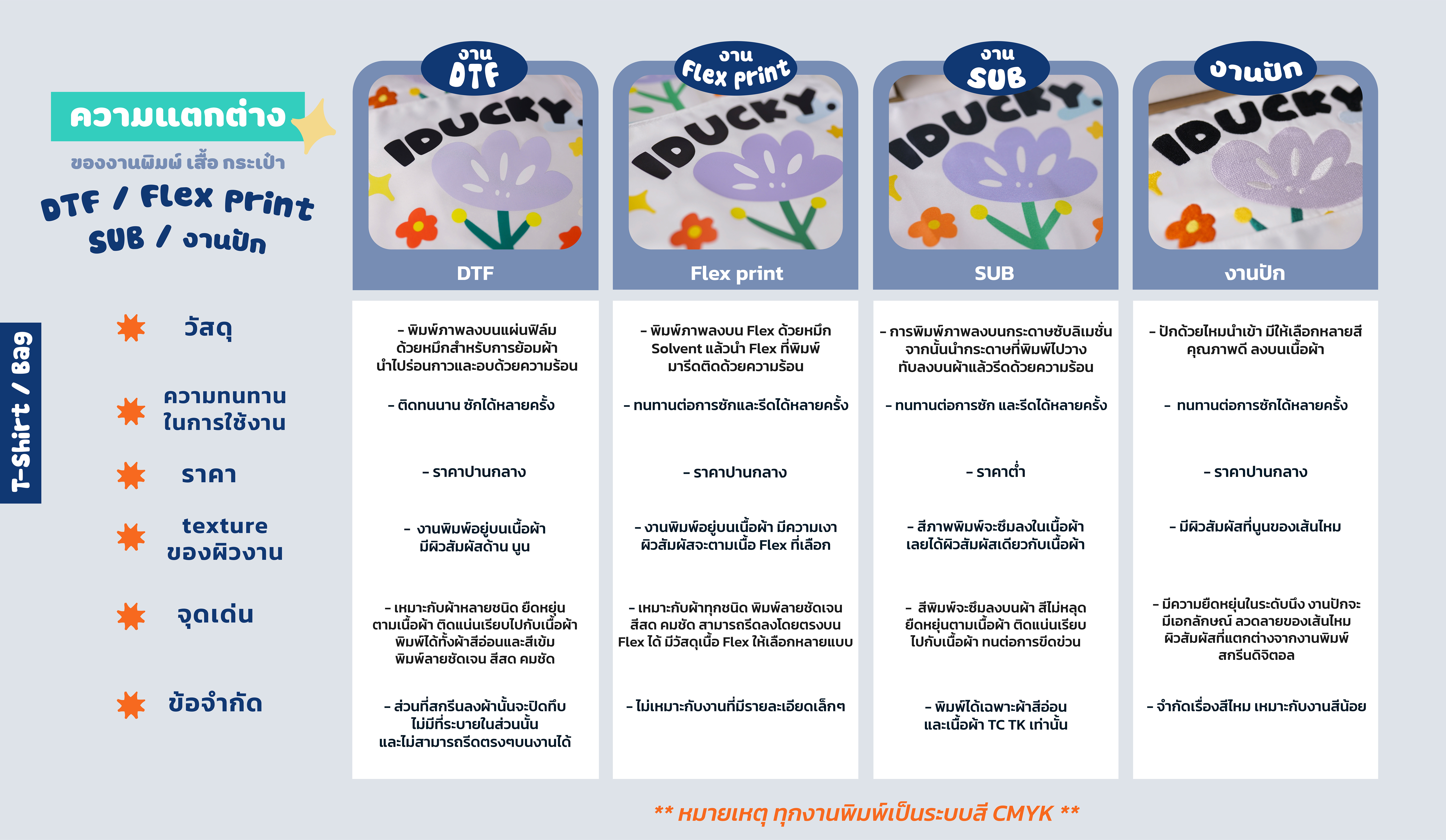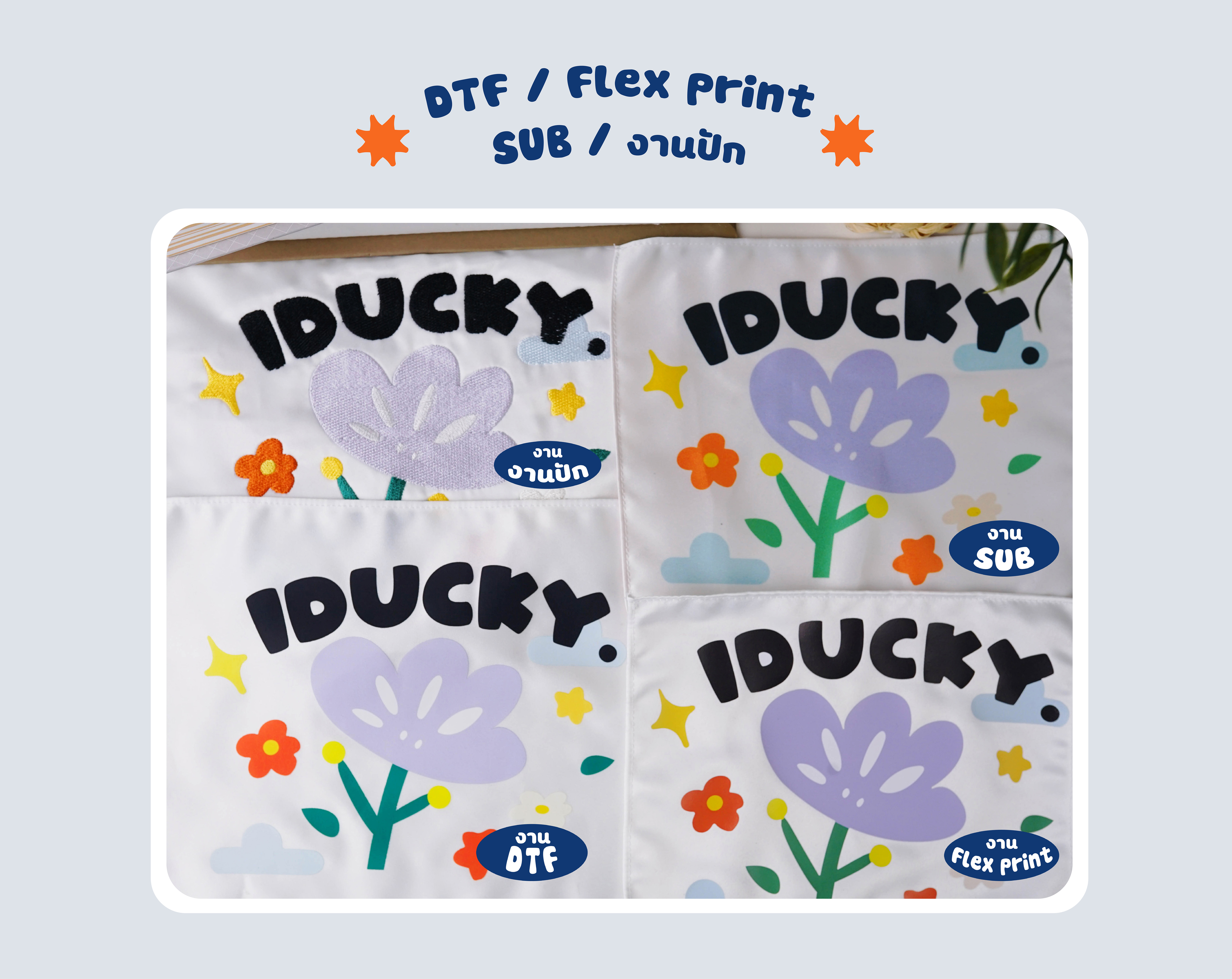2.งานพิมพ์ DTF/DFT เป็นงานที่พิมพ์ลงบนแผ่นฟิล์มเฉพาะ และนำไปโรยผงกาวเฉพาะ จากนั้นนำไปกดด้วยความร้อน สามารถพิมพ์ได้ทั้งผ้าสีอ่อนและสีเข้ม